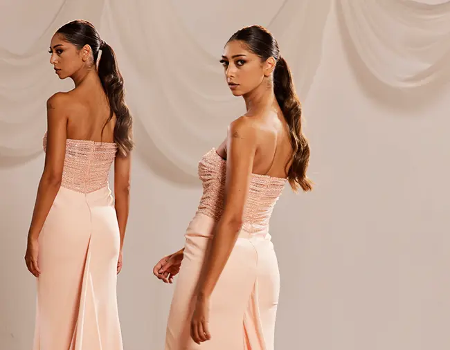 FW 138 - Blue Mikado dress featuring an off-the-shoulder draped top with intricate embroidery detailing and long sleeves underneath.
