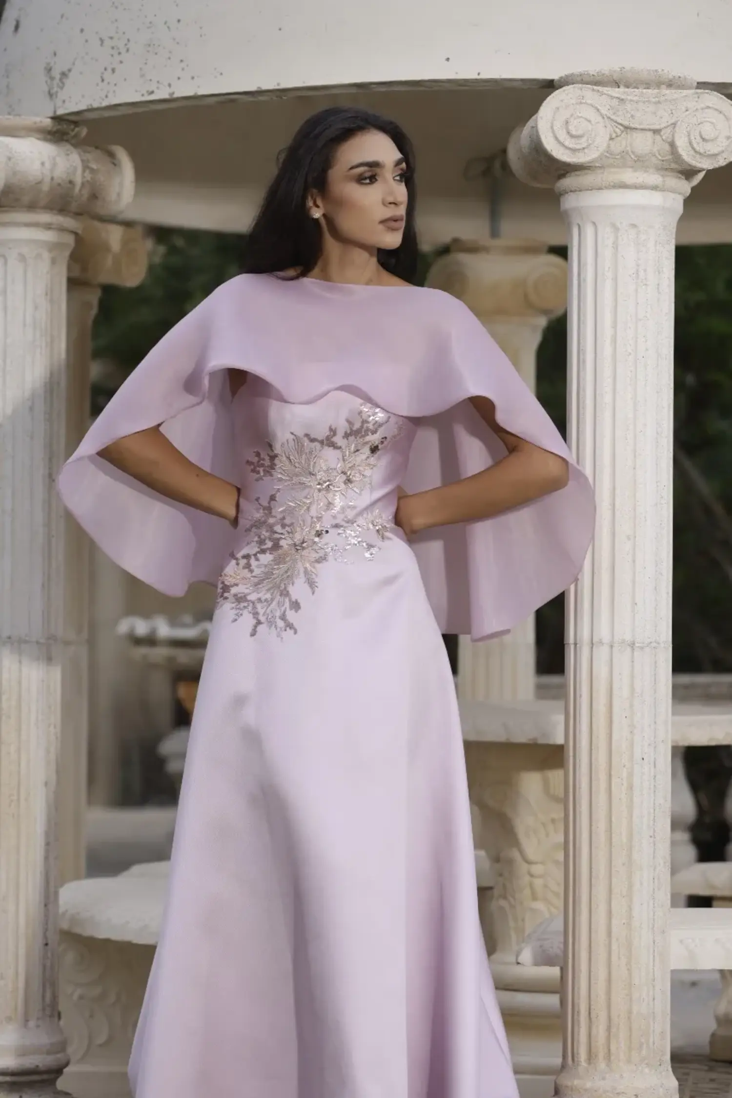 LONG SLEEVE CREPE GOWN WITH LACE CUT-OUT