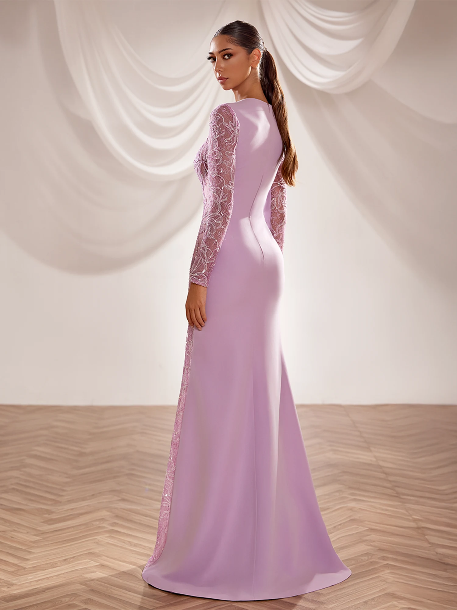 beadwork cascades from bodice to hem on one side with a sheer embellished sleeve