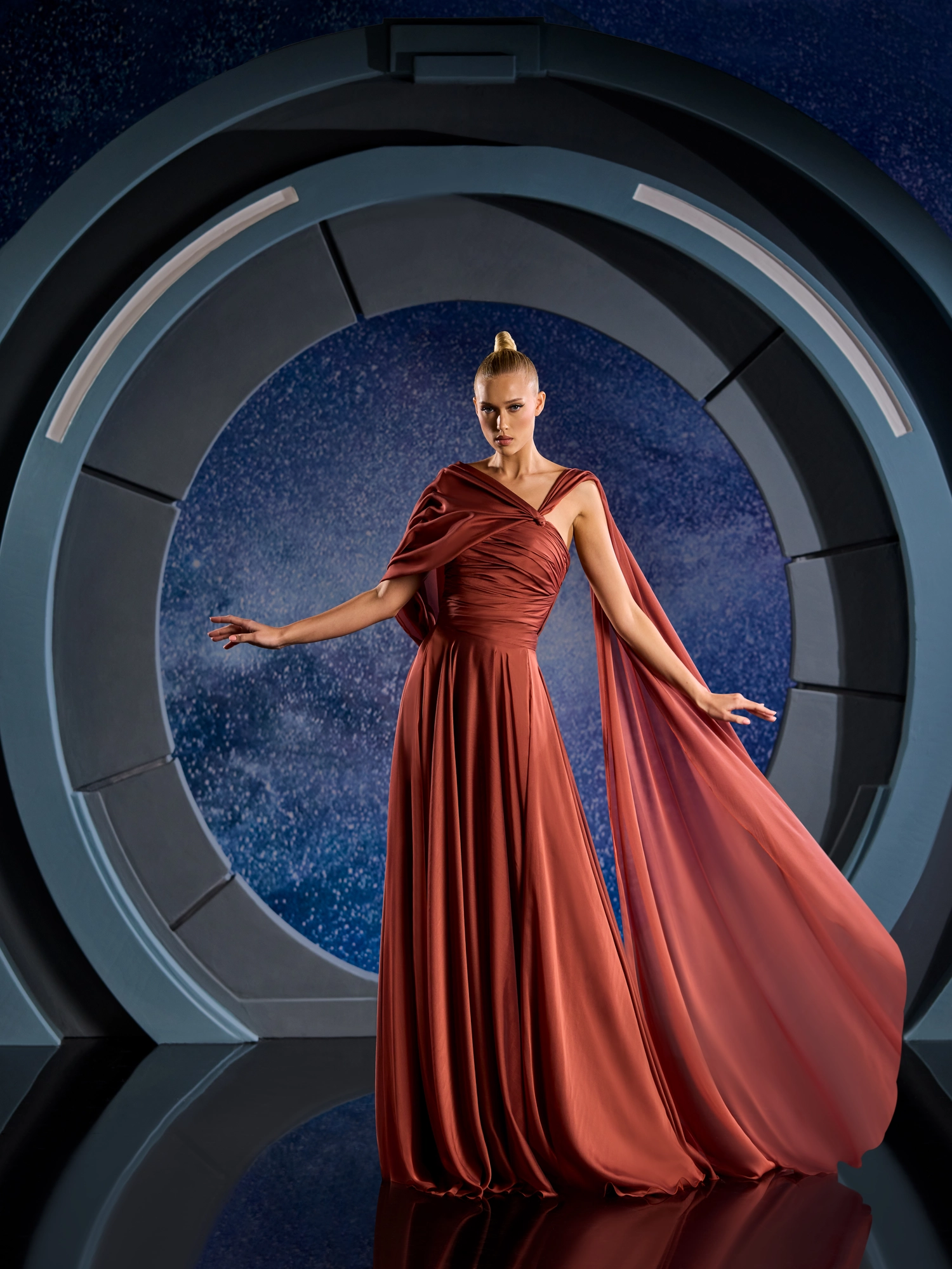 FW 129 - Brick-colored mousseline dress featuring a flowy skirt and a fitted draped bodice