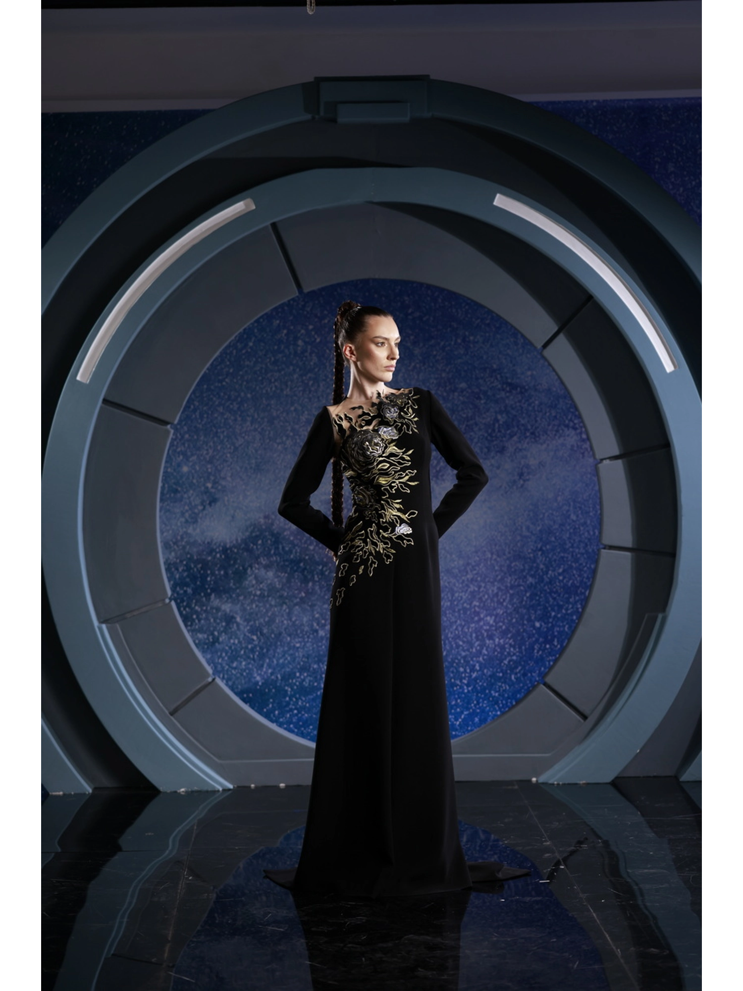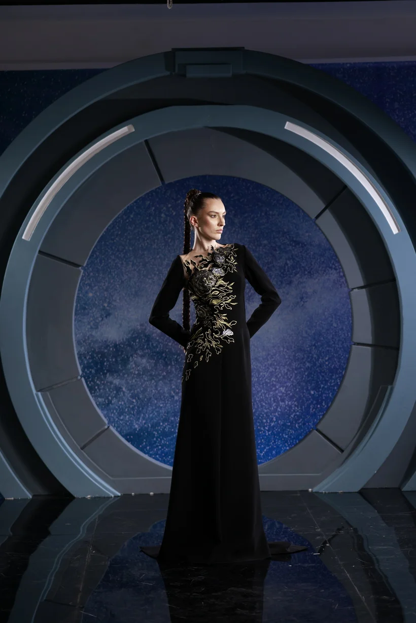 FW 112 - Black crepe dress adorned with shimmering gold sequins.