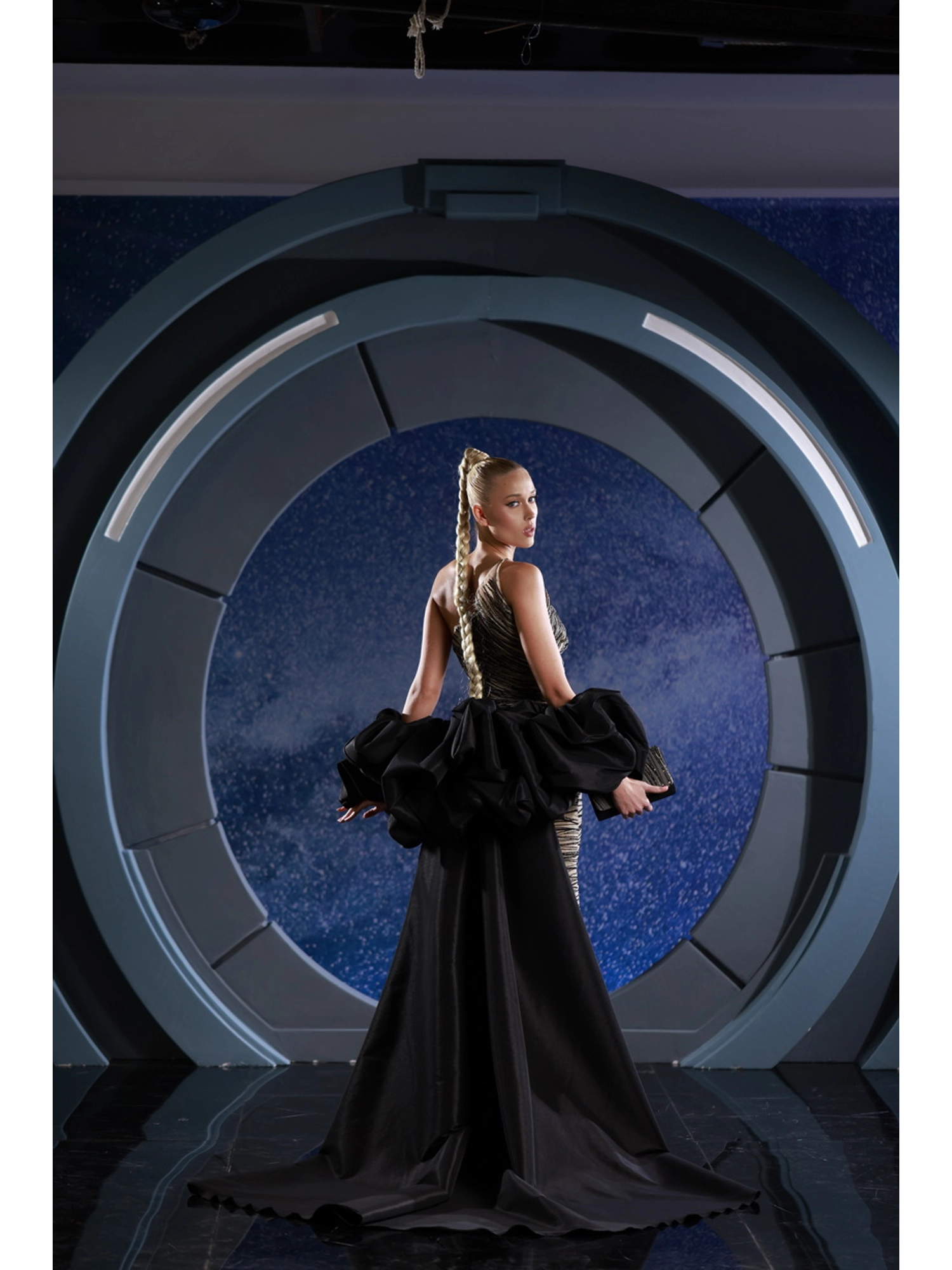 FW 128 - Electric taffeta dress, featuring a tight skirt with a daring slit and a voluminous overskirt