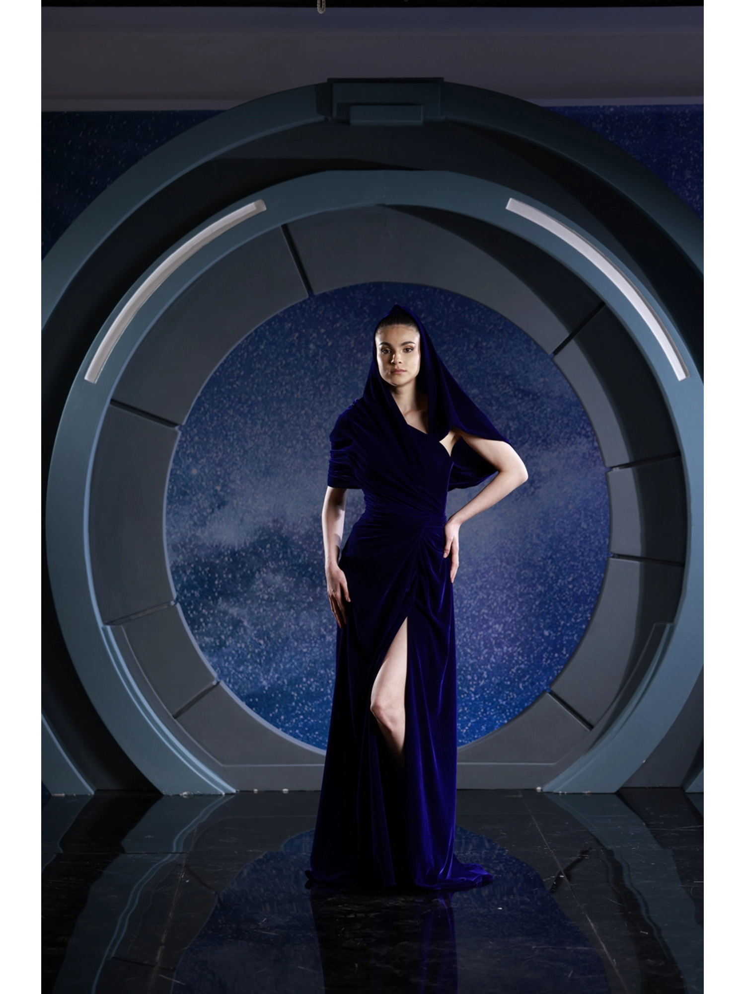 FW 123 - Royal blue velvet dress, featuring a high slit that adds drama to your look, while a striking one-shoulder strap holds a unique hood, adding a touch of mystery and elegance.