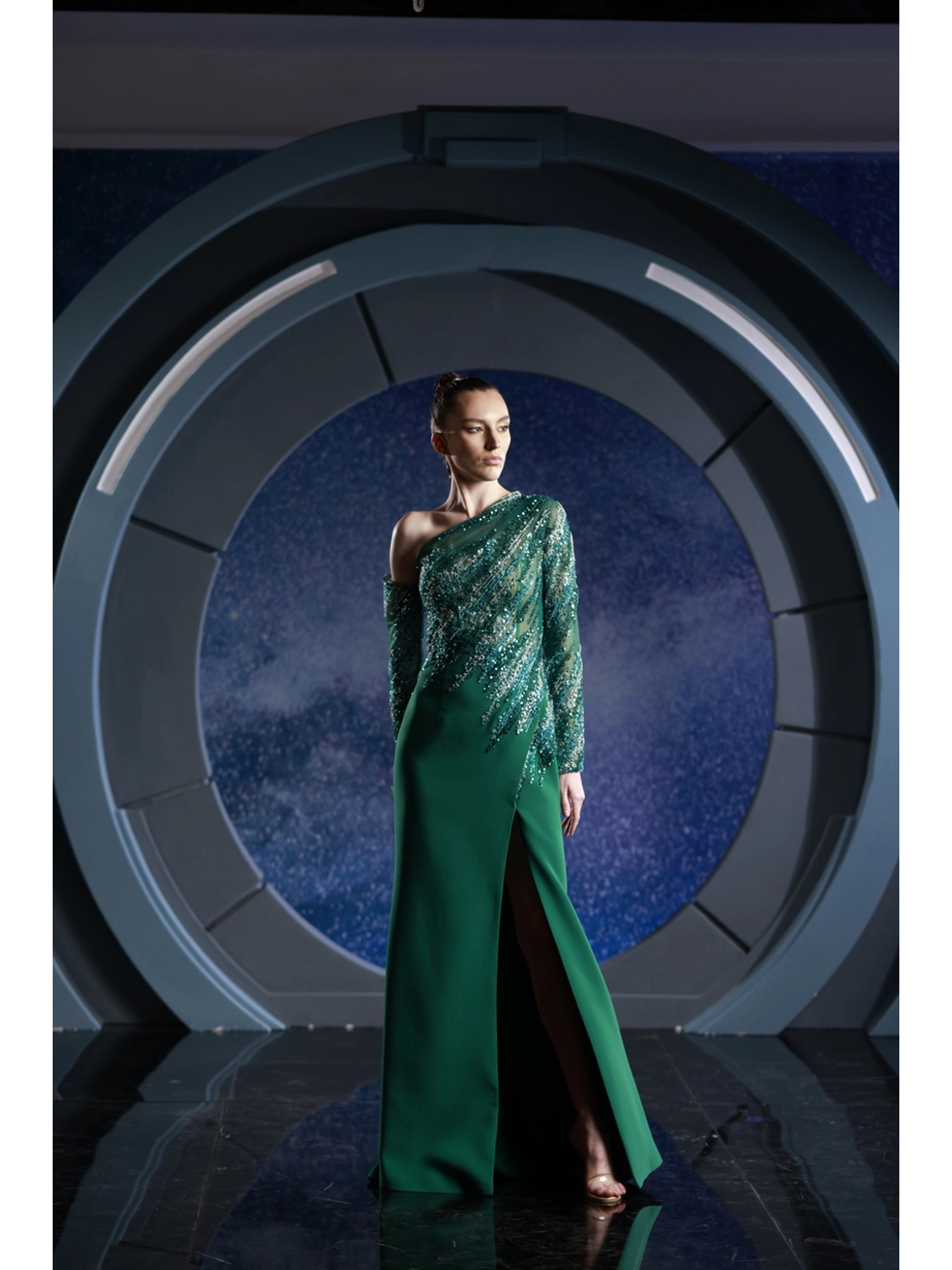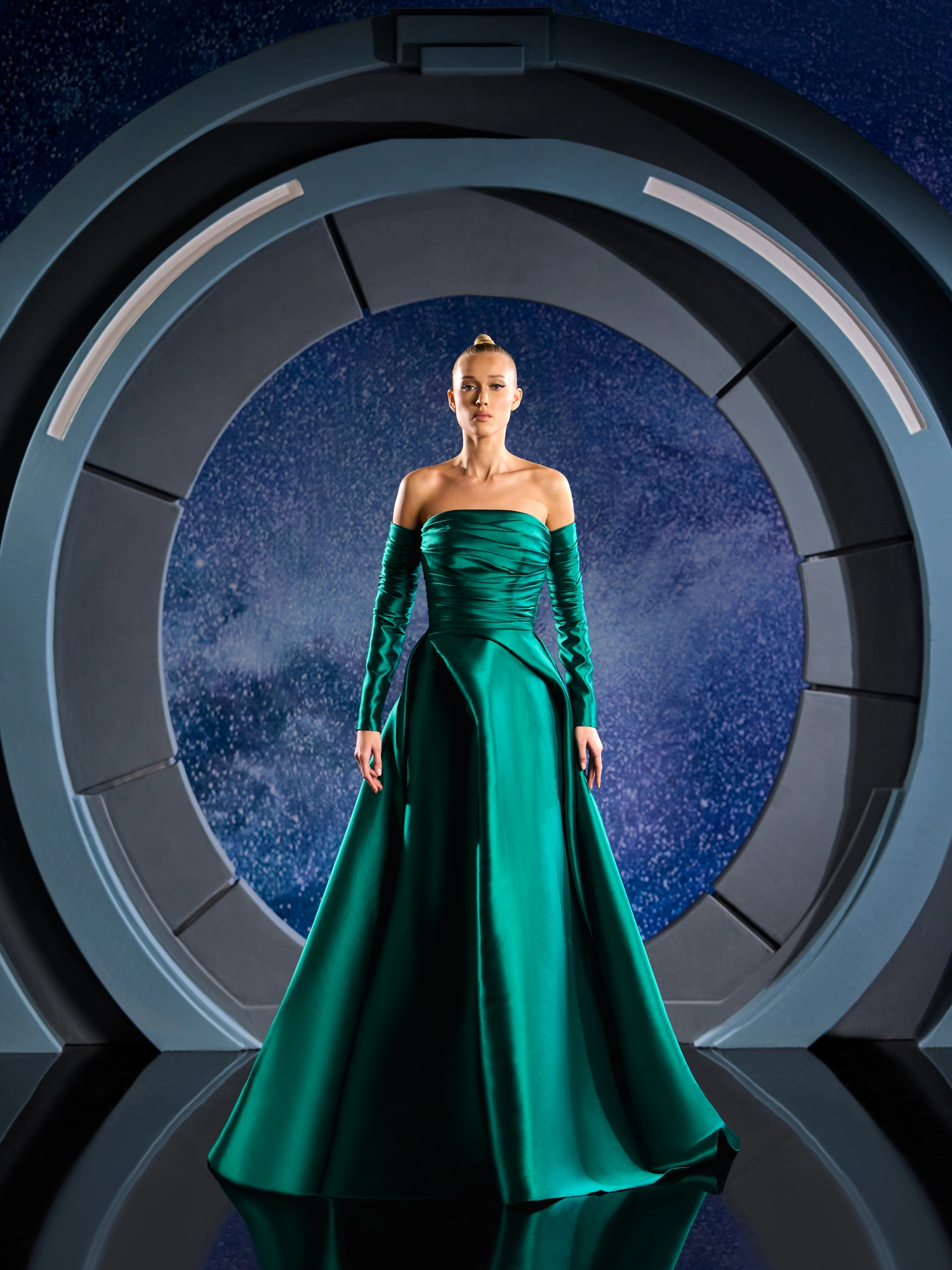 FW 125 - Emerald Mikado dress, where elegance meets celestial allure.