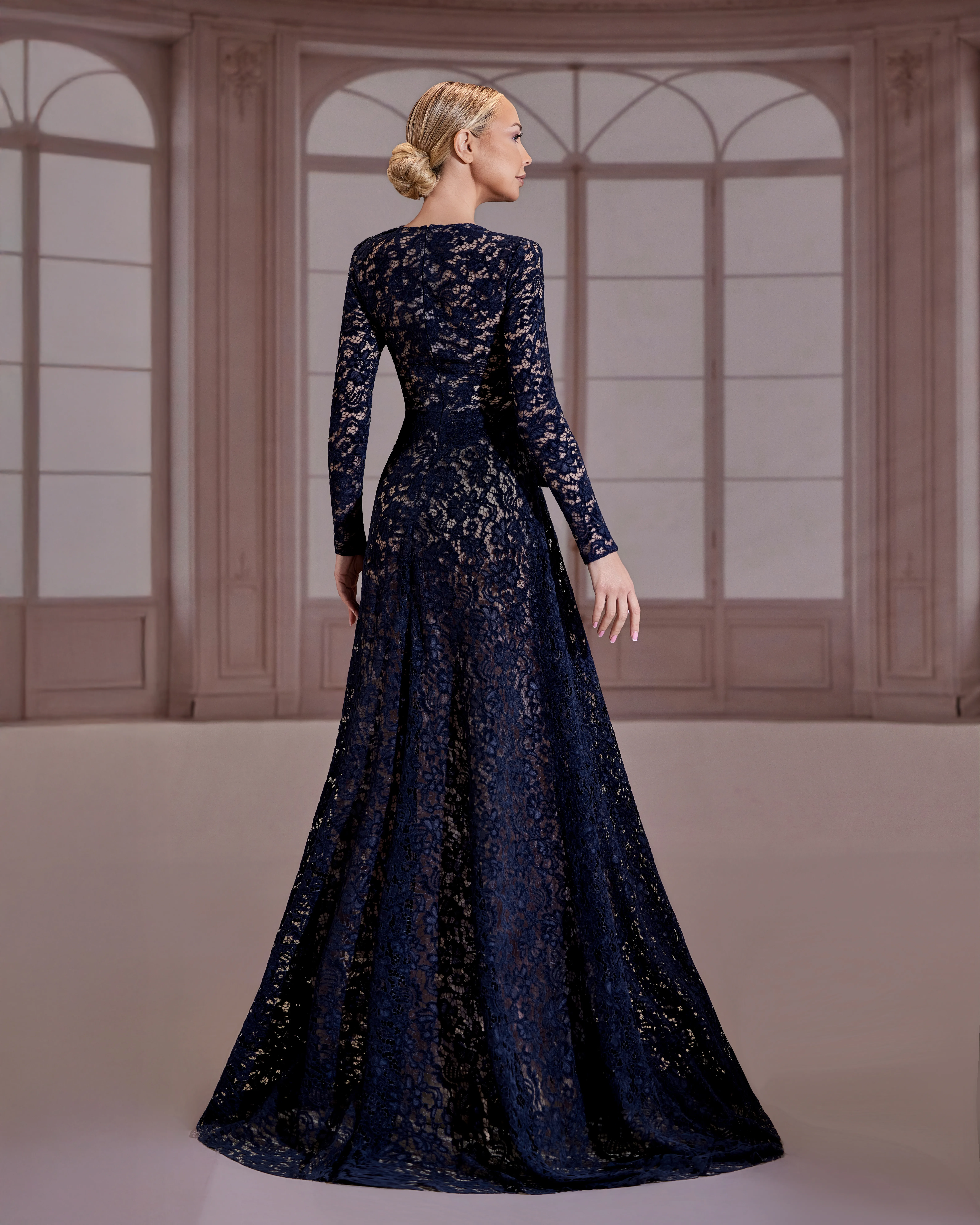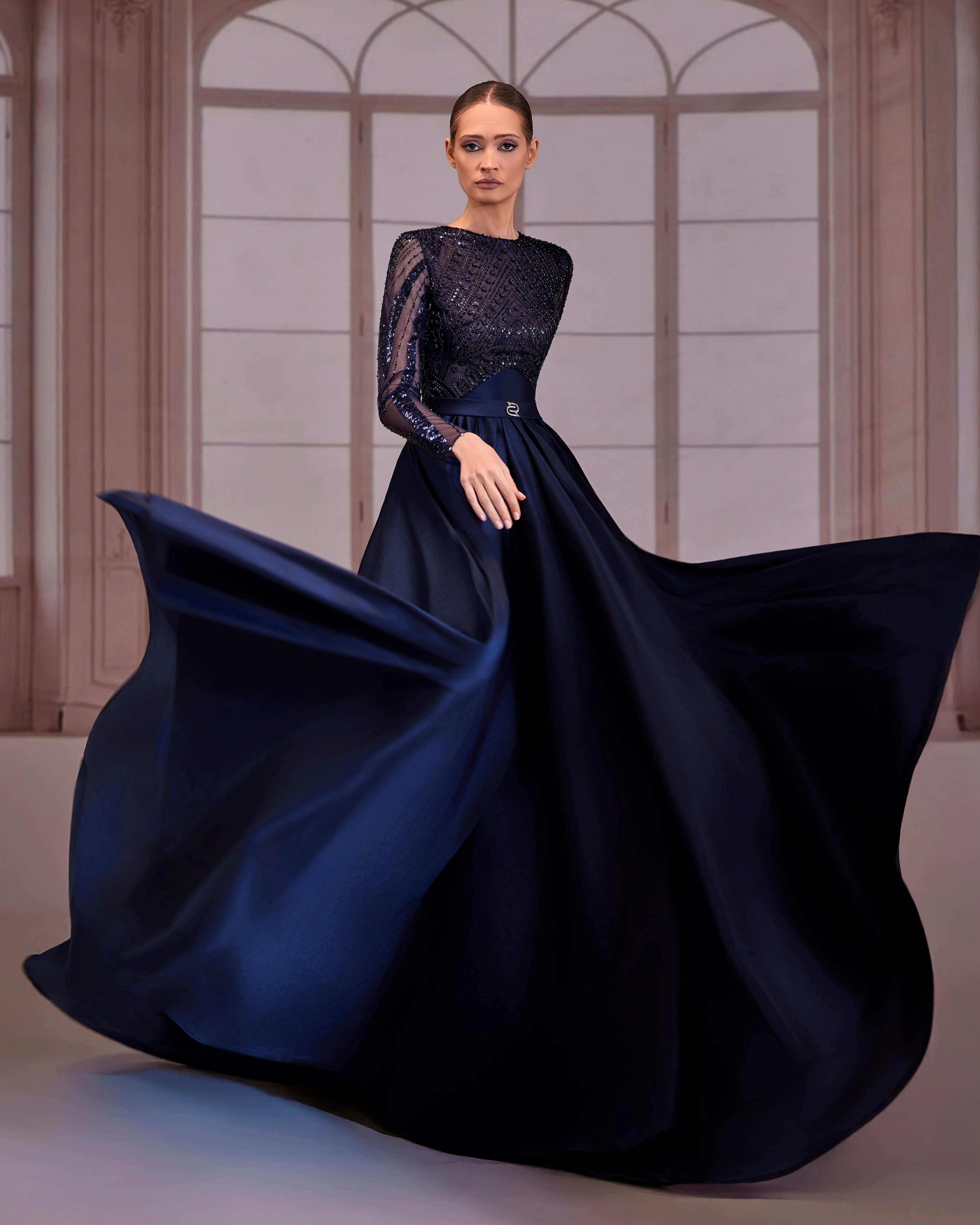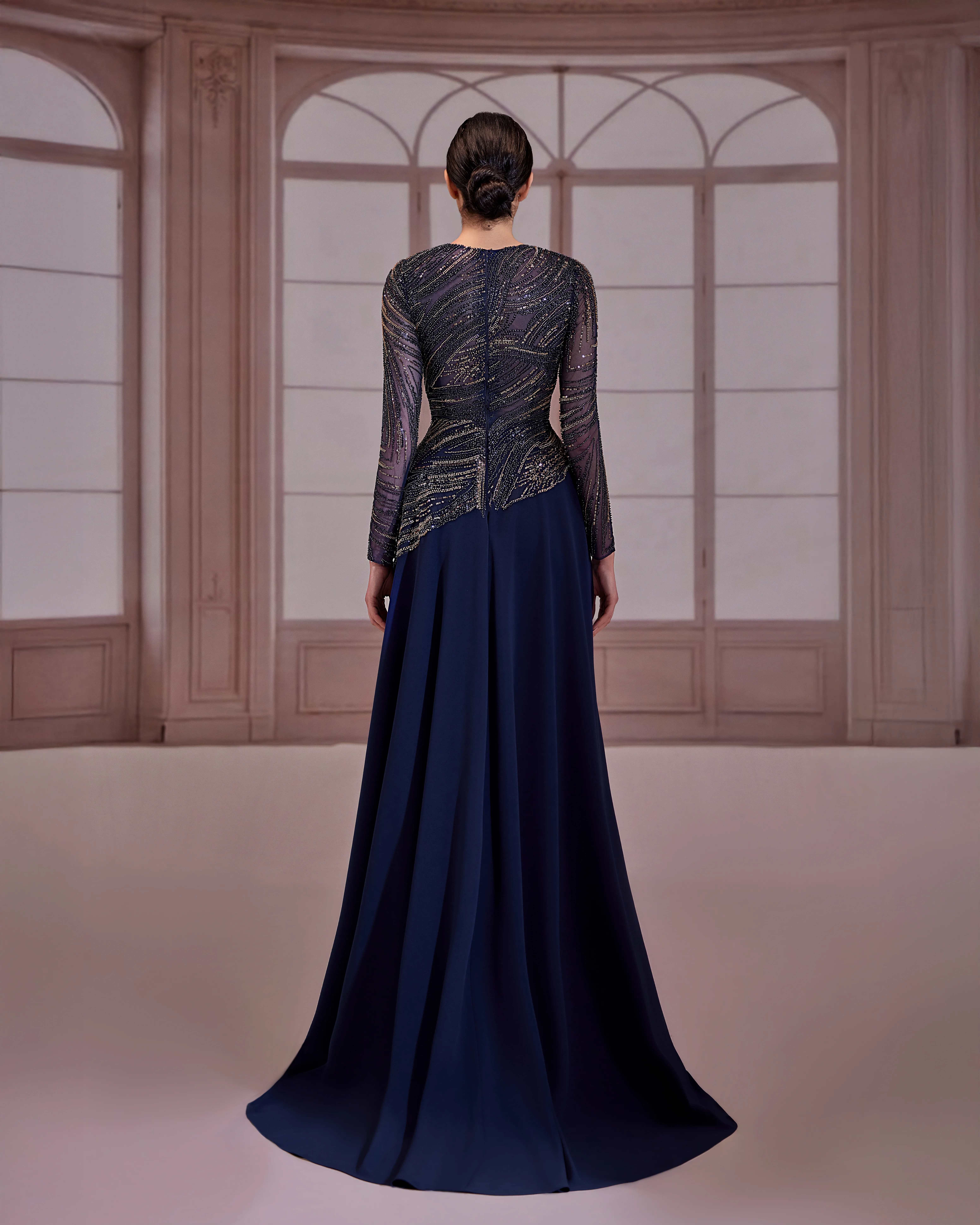 Navy blue dress with a beaded bodice and long beaded sleeves, featuring a voluminous taffeta skirt.