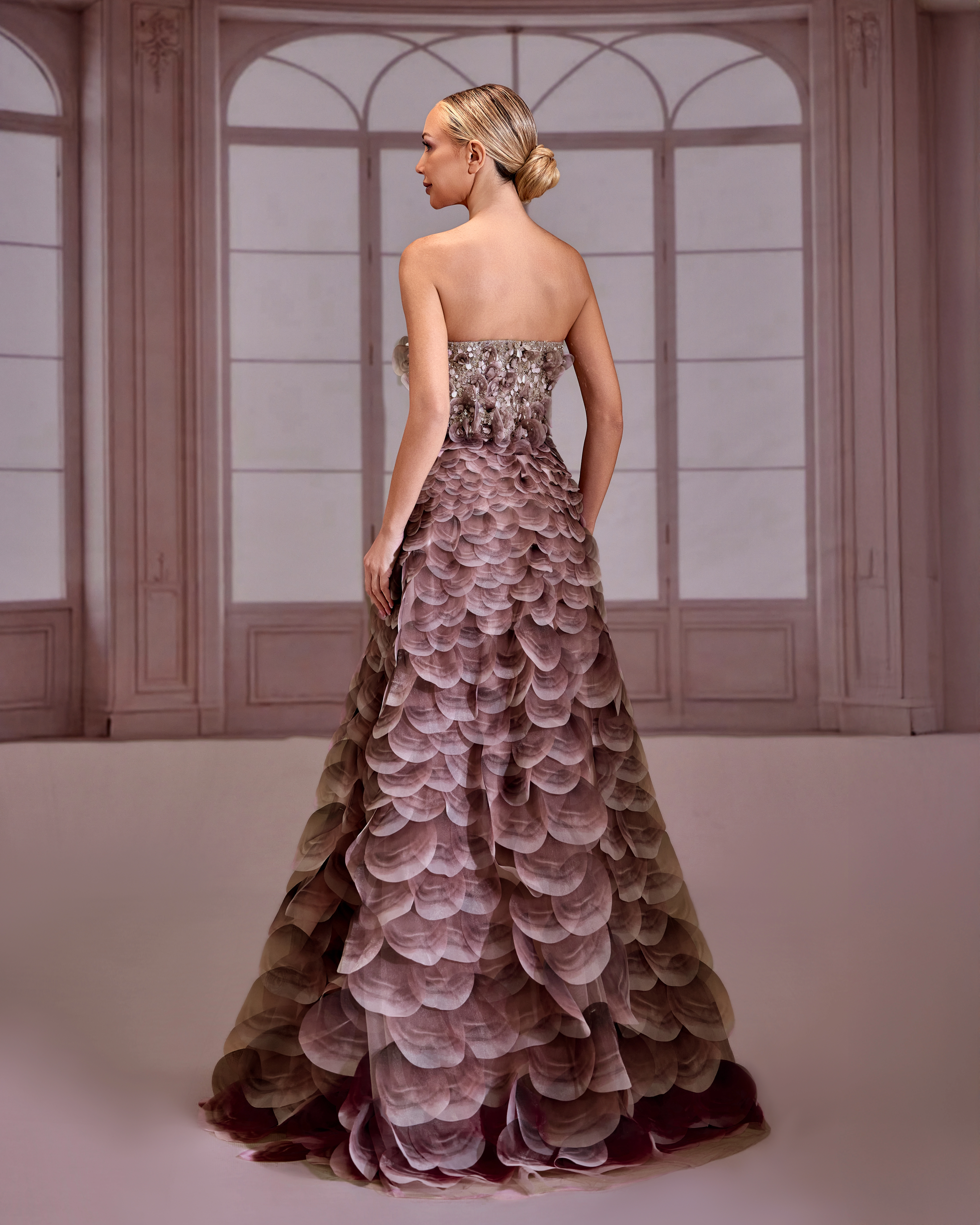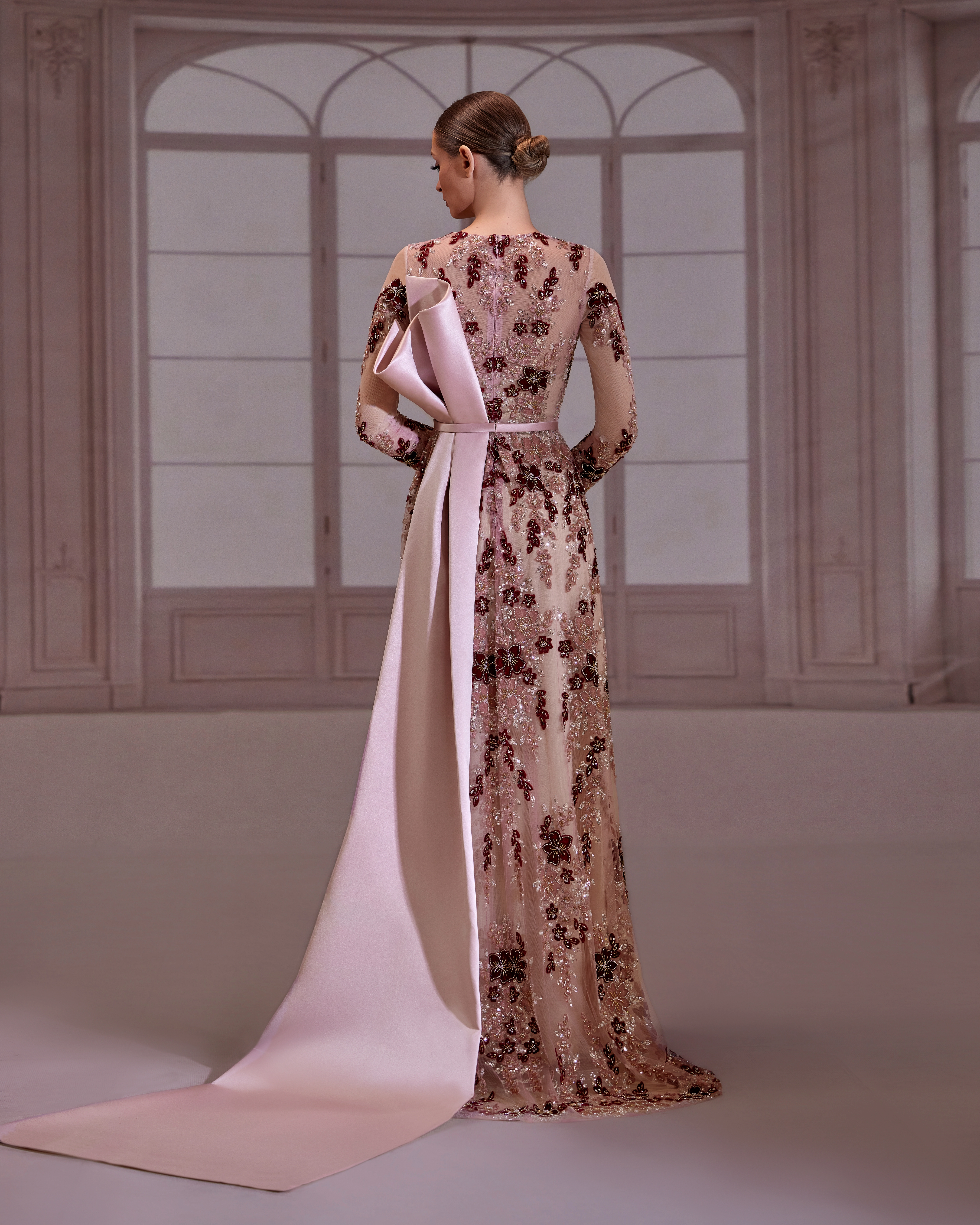 Pink strapless shiffon dress with a floral beaded bodice and pleated straight skirt. Finished with flowing detachable sleeves.